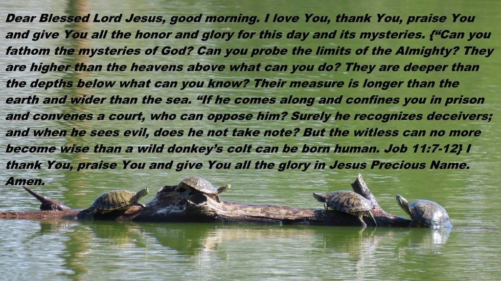 Dear Blessed Lord Jesus, good morning. I love You, thank You, praise You and give You all the honor and glory for this day and its mysteries. {“Can you fathom the mysteries of God? Can you probe the limits of the Almighty? They are higher than the heavens above what can you do? They are deeper than the depths below what can you know? Their measure is longer than the earth and wider than the sea. “If he comes along and confines you in prison and convenes a court, who can oppose him? Surely he recognizes deceivers; and when he sees evil, does he not take note? But the witless can no more become wise than a wild donkey’s colt can be born human. Job 11:7-12} I thank You, praise You and give You all the glory in Jesus Precious Name. Amen.