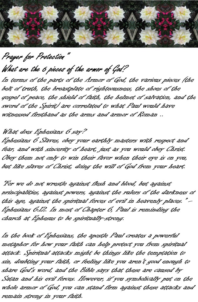 Finally Brethren, be strong in the Lord and in his mighty power. Put on the full armor of God, so that you can take your stand against the devil’s schemes. For our struggle is not against flesh and blood, but against the rulers, against the authorities, against the powers of this dark world and against the spiritual forces of evil in the heavenly realms. Therefore put on the full armor of God, so that when the day of evil comes, you may be able to stand your ground, and after you have done everything, to stand. Stand firm then, with the belt of truth buckled around your waist, with the breastplate of righteousness in place, and with your feet fitted with the readiness that comes from the gospel of peace. In addition to all this, take up the shield of faith, with which you can extinguish all the flaming arrows of the evil one. Take the helmet of salvation and the sword of the Spirit, which is the word of God. And pray in the Spirit on all occasions with all kinds of prayers and requests. With this in mind, be alert and always keep on praying for all the Lord’s people. Pray also for me, that whenever I speak, words may be given me so that I will fearlessly make known the mystery of the gospel, for which I am an ambassador in chains. Pray that I may declare it fearlessly, as I should.