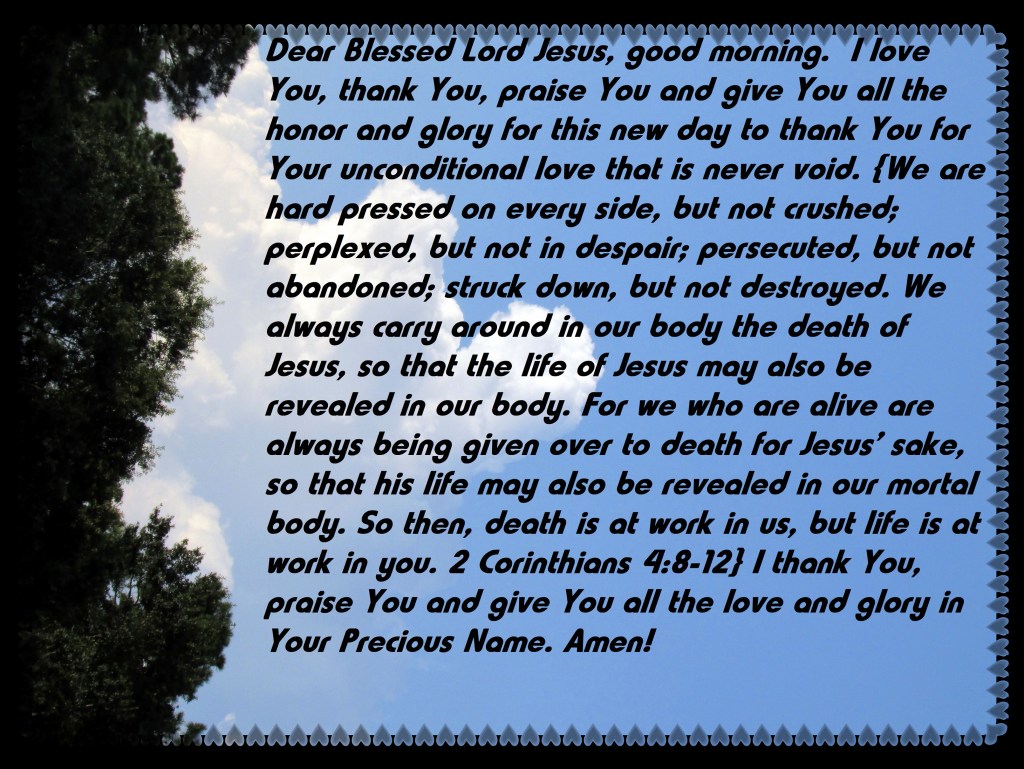 Dear Blessed Lord Jesus, good morning. I love You, thank You, praise You and give You all the honor and glory for this new day to thank You for Your unconditional love that is never void. {We are hard pressed on every side, but not crushed; perplexed, but not in despair; persecuted, but not abandoned; struck down, but not destroyed. We always carry around in our body the death of Jesus, so that the life of Jesus may also be revealed in our body. For we who are alive are always being given over to death for Jesus’ sake, so that his life may also be revealed in our mortal body. So then, death is at work in us, but life is at work in you. 2 Corinthians 4:8-12} I thank You, praise You and give You all the love and glory in Your Precious Name. Amen!