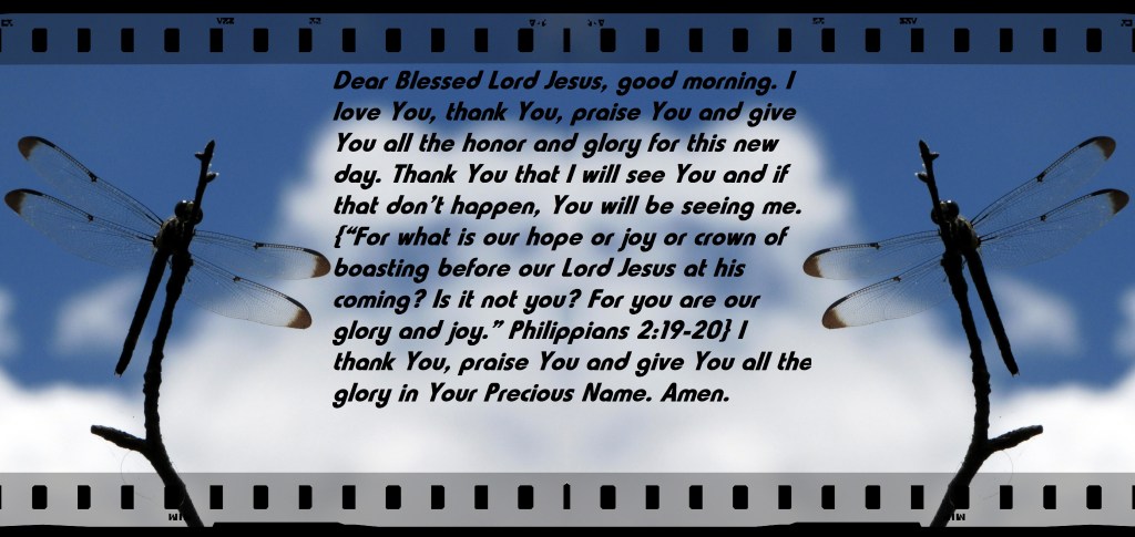 Dear Blessed Lord Jesus, good morning. I love You, thank You, praise You and give You all the honor and glory for this new day. Thank You that I will see You and if that don’t happen, You will be seeing me. {“For what is our hope or joy or crown of boasting before our Lord Jesus at his coming? Is it not you? For you are our glory and joy.” Philippians 2:19-20} I thank You, praise You and give You all the glory in Your Precious Name. Amen.