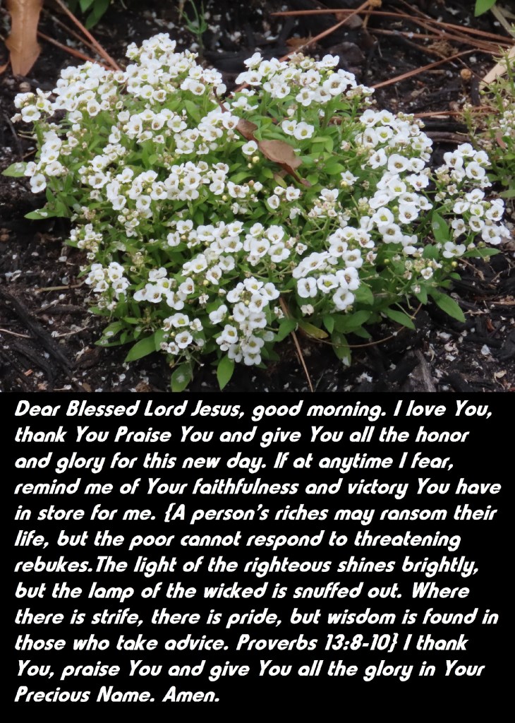 Dear Blessed Lord Jesus, good morning. I love You, thank You, Praise You and give You all the honor and glory for this new day. If at anytime I fear, remind me of Your faithfulness and victory You have in store for me. {A person’s riches may ransom their life, but the poor cannot respond to threatening rebukes.The light of the righteous shines brightly, but the lamp of the wicked is snuffed out. Where there is strife, there is pride, but wisdom is found in those who take advice. Proverbs 13:8-10} I thank You, praise You and give You all the glory in Your Precious Name. Amen.