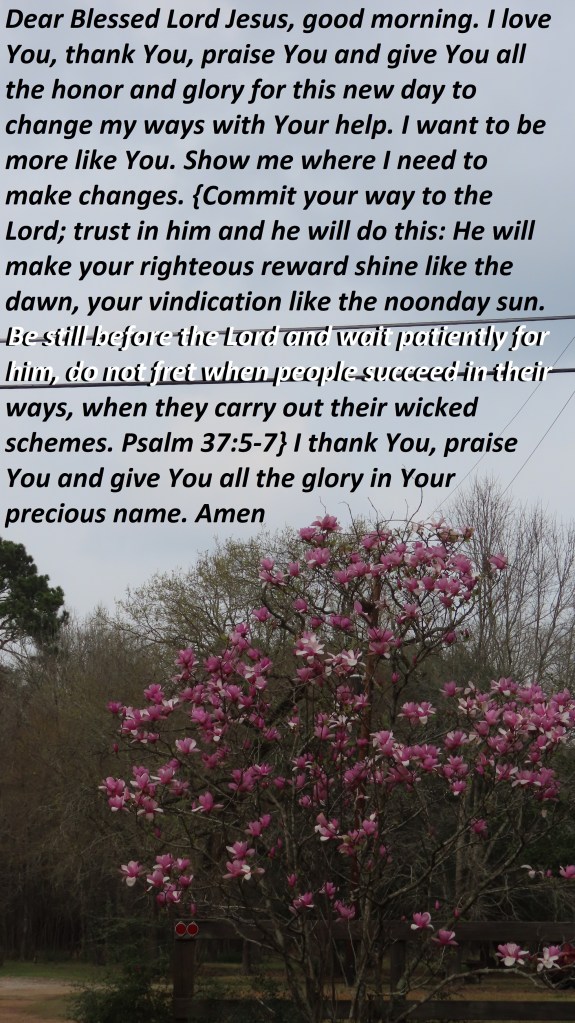 Dear Blessed Lord Jesus, good morning. I love You, thank You, praise You and give You all the honor and glory for this new day to change my ways with Your help. I want to be more like You. Show me where I need to make changes. {Commit your way to the Lord; trust in him and he will do this: He will make your righteous reward shine like the dawn, your vindication like the noonday sun. Be still before the Lord and wait patiently for him, do not fret when people succeed in their ways, when they carry out their wicked schemes. Psalm 37:5-7} I thank You, praise You and give You all the glory in Your precious name. Amen