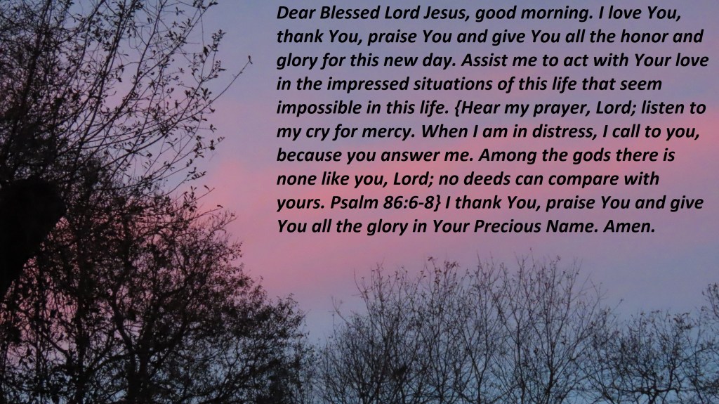 Dear Blessed Lord Jesus, good morning. I love You, thank You, praise You and give You all the honor and glory for this new day. Assist me to act with Your love in the impressed situations of this life that seem impossible in this life. {Hear my prayer, Lord; listen to my cry for mercy. When I am in distress, I call to you, because you answer me. Among the gods there is none like you, Lord; no deeds can compare with yours. Psalm 86:6-8} I thank You, praise You and give You all the glory in Your Precious Name. Amen.