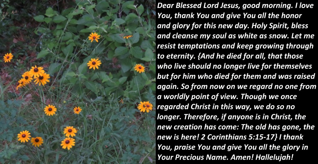 Dear Blessed Lord Jesus, good morning. I love You, thank You and give You all the honor and glory for this new day. Holy Spirit, bless and cleanse my soul as white as snow. Let me resist temptations and keep growing through to eternity. {And he died for all, that those who live should no longer live for themselves but for him who died for them and was raised again. So from now on we regard no one from a worldly point of view. Though we once regarded Christ in this way, we do so no longer. Therefore, if anyone is in Christ, the new creation has come: The old has gone, the new is here! 2 Corinthians 5:15-17} I thank You, praise You and give You all the glory in Your Precious Name. Amen! Hallelujah!
