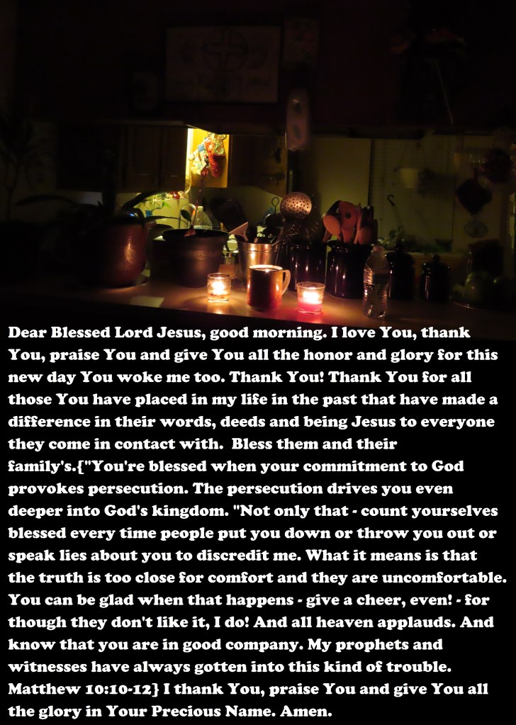 Dear Blessed Lord Jesus, good morning. I love You, thank You, praise You and give You all the honor and glory for this new day You woke me too. Thank You! Thank You for all those You have placed in my life in the past that have made a difference in their words, deeds and being Jesus to everyone they come in contact with. Bless them and their family’s.{“You’re blessed when your commitment to God provokes persecution. The persecution drives you even deeper into God’s kingdom. “Not only that – count yourselves blessed every time people put you down or throw you out or speak lies about you to discredit me. What it means is that the truth is too close for comfort and they are uncomfortable. You can be glad when that happens – give a cheer, even! – for though they don’t like it, I do! And all heaven applauds. And know that you are in good company. My prophets and witnesses have always gotten into this kind of trouble. Matthew 10:10-12} I thank You, praise You and give You all the glory in Your Precious Name. Amen.