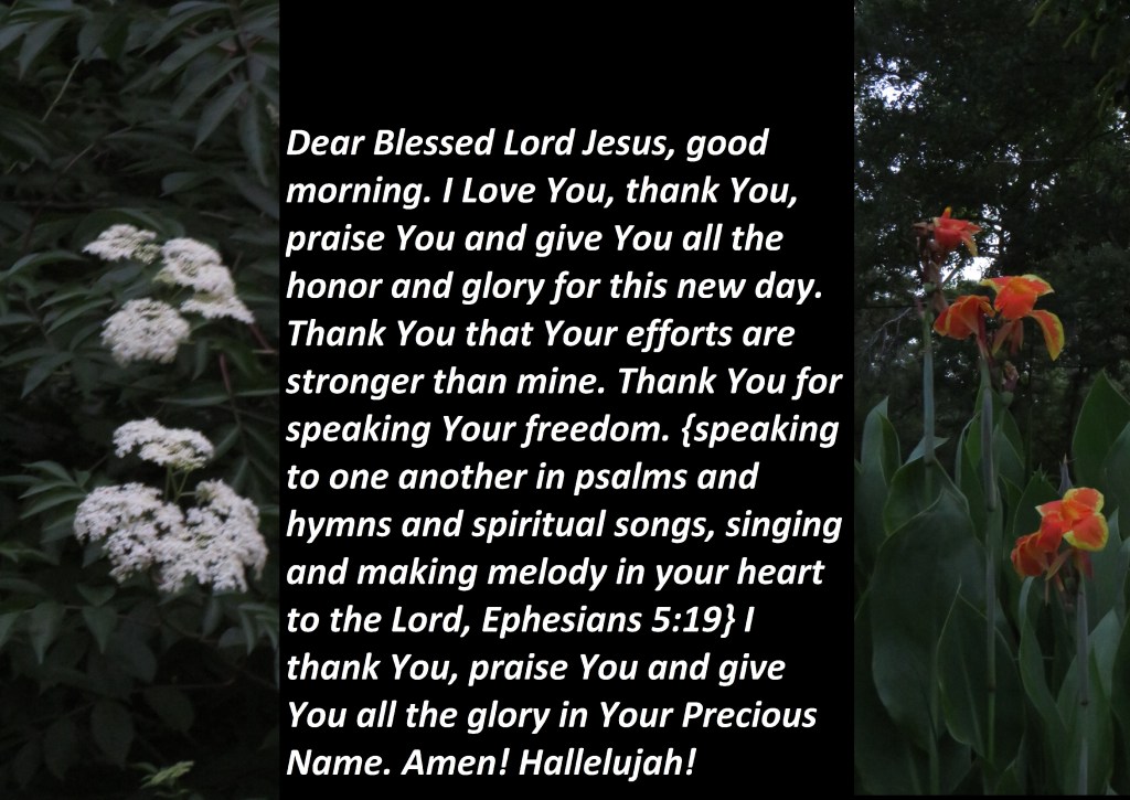 Dear Blessed Lord Jesus, good morning. I Love You, thank You, praise You and give You all the honor and glory for this new day. Thank You that Your efforts are stronger than mine. Thank You for speaking Your freedom. {speaking to one another in psalms and hymns and spiritual songs, singing and making melody in your heart to the Lord, Ephesians 5:19} I thank You, praise You and give You all the glory in Your Precious Name. Amen! Hallelujah!