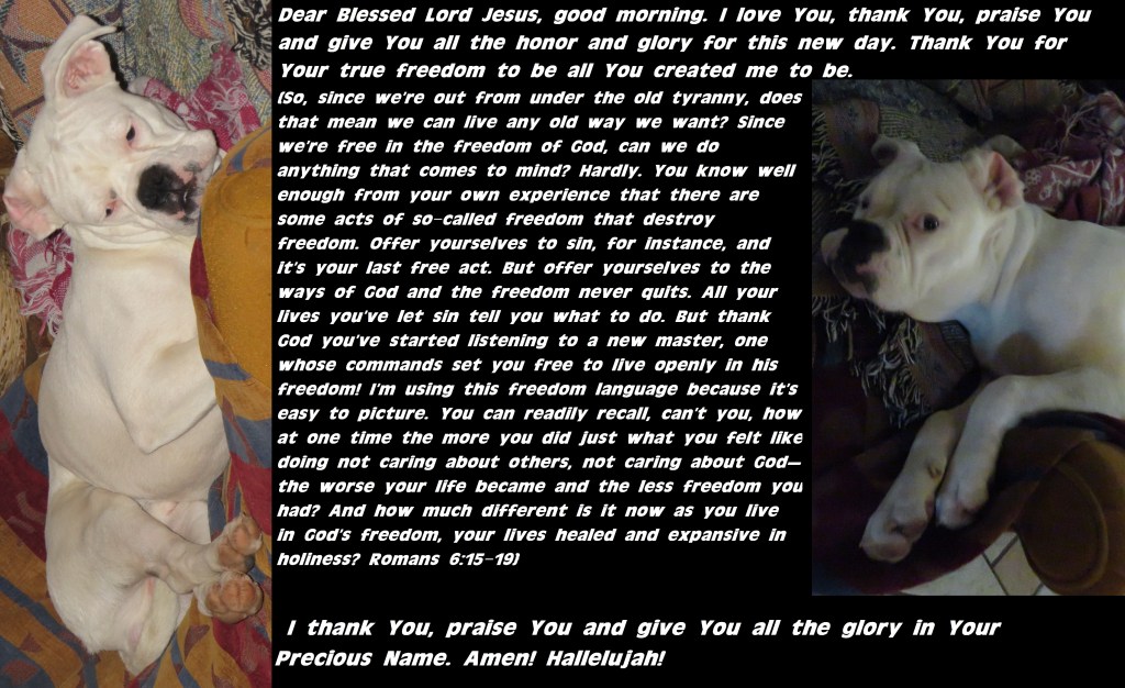 Dear Blessed Lord Jesus, good morning. I love You, thank You, praise You and give You all the honor and glory for this new day. Thank You for Your true freedom to be all You created me to be. {So, since we’re out from under the old tyranny, does that mean we can live any old way we want? Since we’re free in the freedom of God, can we do anything that comes to mind? Hardly. You know well enough from your own experience that there are some acts of so-called freedom that destroy freedom. Offer yourselves to sin, for instance, and it’s your last free act. But offer yourselves to the ways of God and the freedom never quits. All your lives you’ve let sin tell you what to do. But thank God you’ve started listening to a new master, one whose commands set you free to live openly in his freedom! I’m using this freedom language because it’s easy to picture. You can readily recall, can’t you, how at one time the more you did just what you felt like doing not caring about others, not caring about God—the worse your life became and the less freedom you had? And how much different is it now as you live in God’s freedom, your lives healed and expansive in holiness? Romans 6:15-19} I thank You, praise You and give You all the glory in Your Precious Name. Amen! Hallelujah!