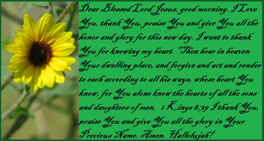 Dear Blessed Lord Jesus, good morning. I Love You, thank You, praise You and give You all the honor and glory for this new day. I want to thank You for knowing my heart. “Then hear in heaven Your dwelling place, and forgive and act and render to each according to all his ways, whose heart You know, for You alone know the hearts of all the sons and daughters of men, 1 Kings 8:39 I thank You, praise You and give You all the glory in Your Precious Name. Amen. Hallelujah!