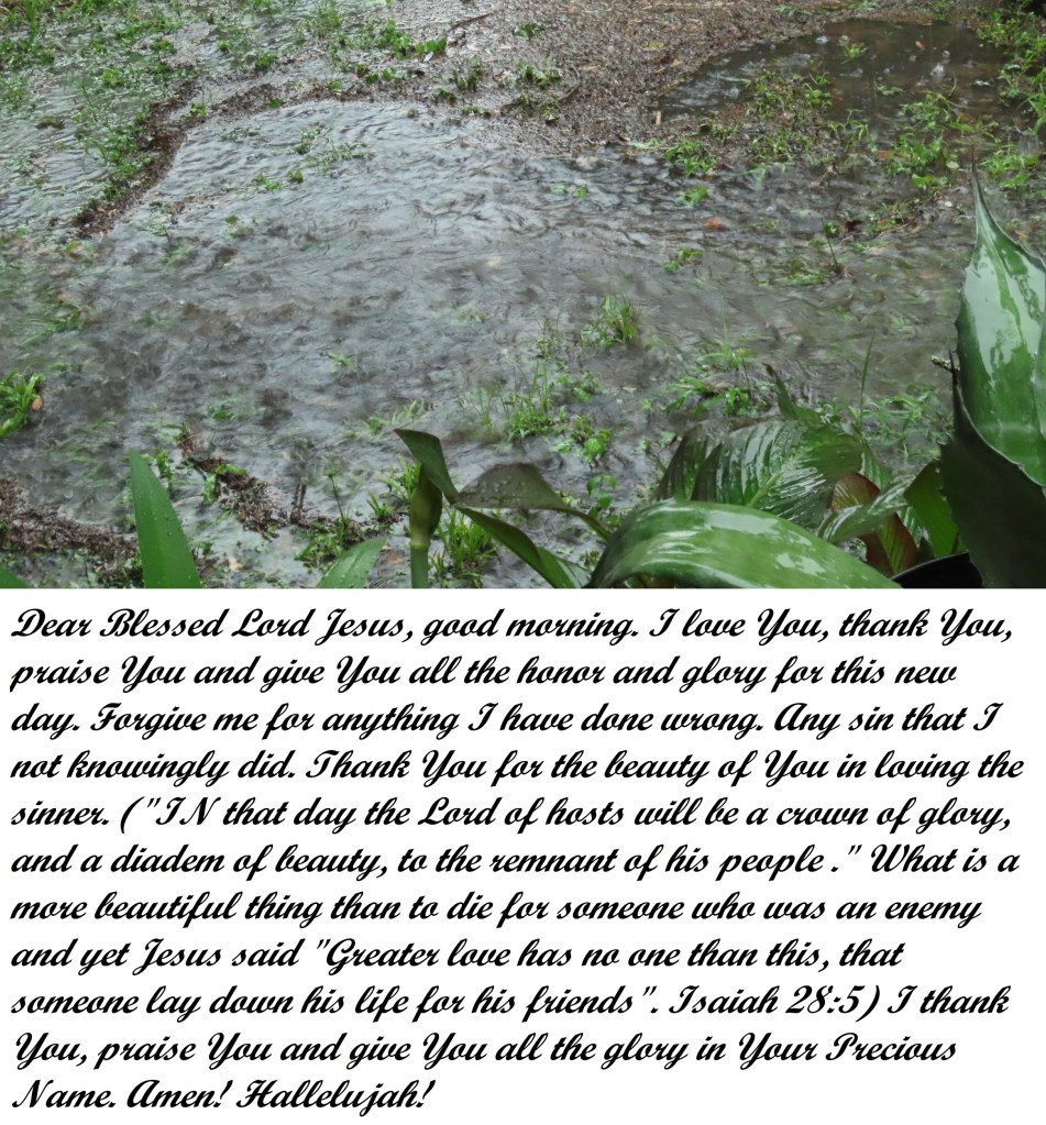 Dear Blessed Lord Jesus, good morning. I love You, thank You, praise You and give You all the honor and glory for this new day. Forgive me for anything I have done wrong. Any sin that I not knowingly did. Thank You for the beauty of You in loving the sinner. (“IN that day the Lord of hosts will be a crown of glory, and a diadem of beauty, to the remnant of his people .” What is a more beautiful thing than to die for someone who was an enemy and yet Jesus said “Greater love has no one than this, that someone lay down his life for his friends”. Isaiah 28:5) I thank You, praise You and give You all the glory in Your Precious Name. Amen! Hallelujah!