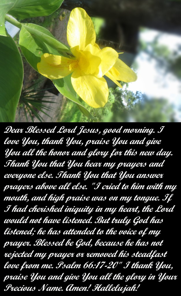 Dear Blessed Lord Jesus, good morning. I love You, thank You, praise You and give You all the honor and glory for this new day. Thank You that You hear my prayers and everyone else. Thank You that You answer prayers above all else. “I cried to him with my mouth, and high praise was on my tongue. If I had cherished iniquity in my heart, the Lord would not have listened. But truly God has listened; he has attended to the voice of my prayer. Blessed be God, because he has not rejected my prayer or removed his steadfast love from me. Psalm 66:17-20” I thank You, praise You and give You all the glory in Your Precious Name. Amen! Hallelujah!