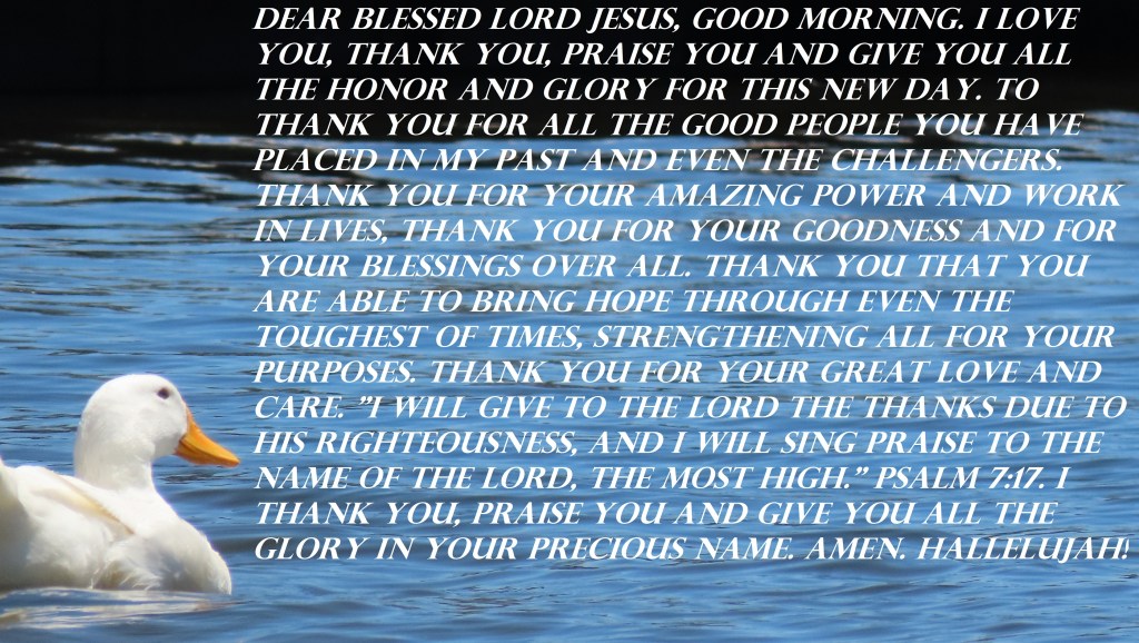 Dear Blessed Lord Jesus, good morning. I love You, thank You, praise You and give You all the honor and glory for this new day. To thank You for all the good people You have placed in my past and even the challengers. Thank you for your amazing power and work in lives, thank you for your goodness and for your blessings over all. Thank you that you are Able to bring hope through even the toughest of times, strengthening all for your purposes. Thank you for your great love and care. “I will give to the Lord the thanks due to his righteousness, and I will sing praise to the name of the Lord, the Most High.” Psalm 7:17. I thank You, praise You and give You all the glory in Your Precious Name. Amen. Hallelujah!