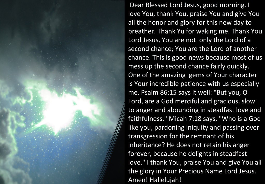 Dear Blessed Lord Jesus, good morning. I love You, thank You, praise You and give You all the honor and glory for this new day to breather. Thank Yu for waking me. Thank You Lord Jesus, You are not only the Lord of a second chance; You are the Lord of another chance. This is good news because most of us mess up the second chance fairly quickly. One of the amazing gems of Your character is Your incredible patience with us especially me. Psalm 86:15 says it well: “But you, O Lord, are a God merciful and gracious, slow to anger and abounding in steadfast love and faithfulness.” Micah 7:18 says, “Who is a God like you, pardoning iniquity and passing over transgression for the remnant of his inheritance? He does not retain his anger forever, because he delights in steadfast love.” I thank You, praise You and give You all the glory in Your Precious Name Lord Jesus. Amen! Hallelujah!