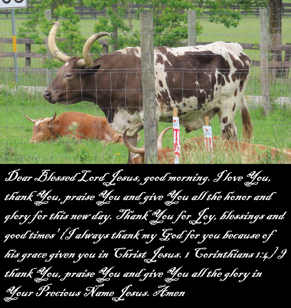 Dear Blessed Lord Jesus, good morning. I love You, thank You, praise You and give You all the honor and glory for this new day. Thank You for Joy, blessings and good times’ {I always thank my God for you because of his grace given you in Christ Jesus. 1 Corinthians 1:4} I thank You, praise You and give You all the glory in Your Precious Name Jesus. Amen