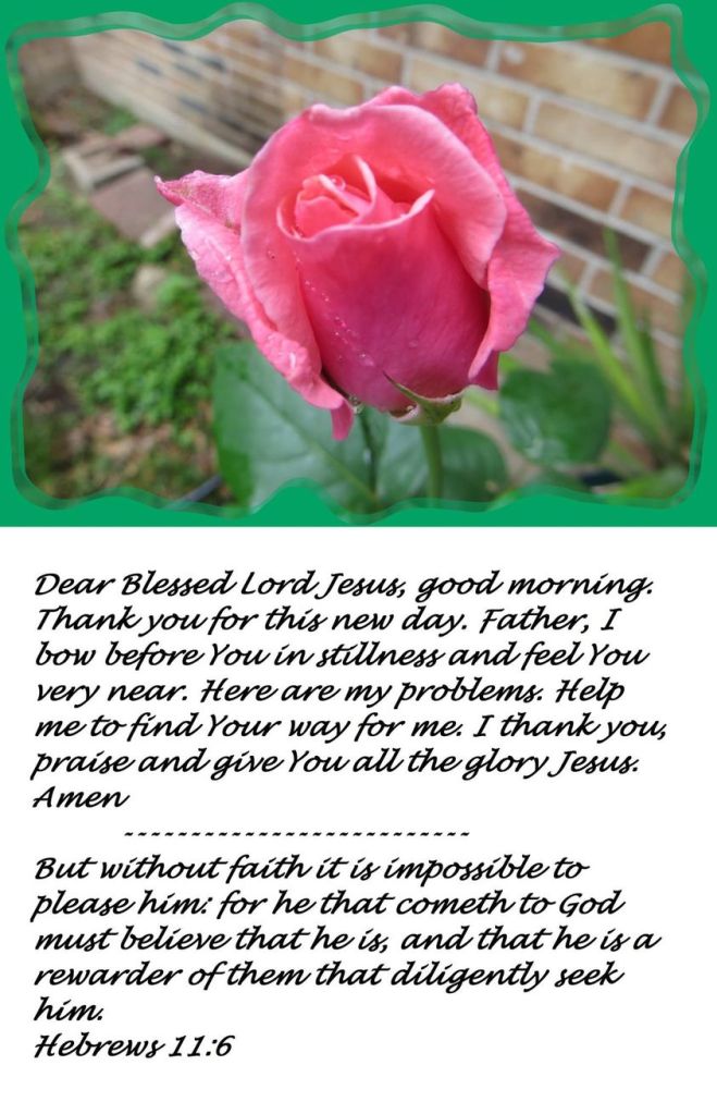Estimado Señor Bendito Jesús, buenos días. Gracias por este nuevo día. Padre, me inclino ante ti en la quietud y siente que muy cerca. Aquí están mis problemas. Ayúdame a encontrar su camino para mí. Te doy gracias, alabanza y darle toda la gloria a Jesús. Amén ————————– Pero sin fe es imposible agradar a Dios; porque el que se acerca a Dios crea que le hay, y que es galardonador de los que le buscan. Hebreos 11: 6La Biblia [Spanish Holy Bible – Reina Valera]================