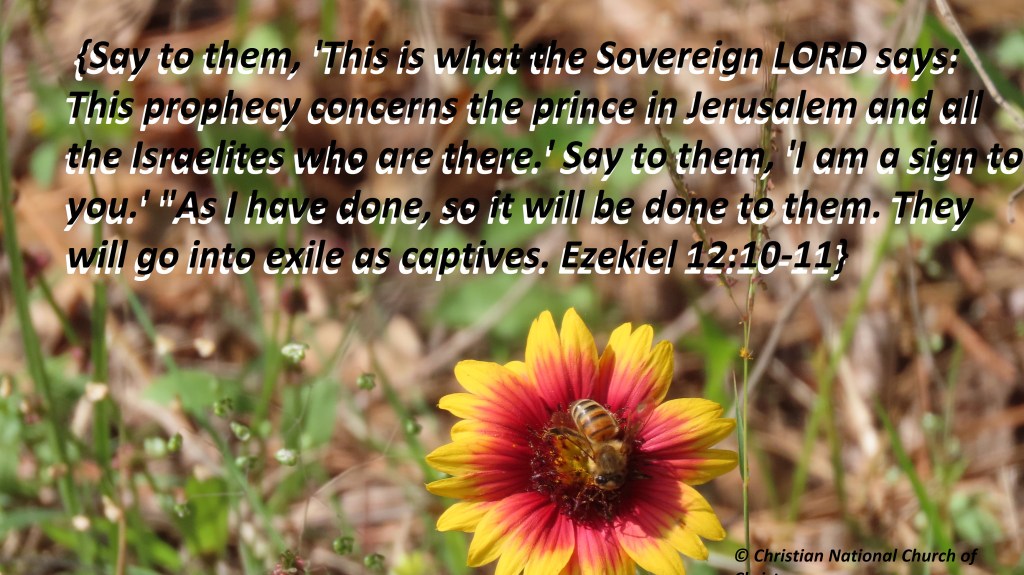 Dear Blessed Lord Jesus, good morning. I love You, thank You, praise You and give You all the honor and glory for this new day to breathe Your fresh air. Forgive me of any sins and keep me as new as this day You made. I praise You and thank You that You do nothing without revealing it to us first, through Your biblical prophets. Bless those who mentor to us. I thank You and praise You that we know the end from the beginning, through Your holy Scriptures and Holy Spirit. I thank You that You use every avenue to reach the lost Lord Jesus, and to bring many to faith in You. Use me as a watchwoman, to sound the alarm that time is short, and that today is the day of salvation for the lost! If only they will trust in You Lord Jesus, for the forgiveness of their sins. May my life be an honest and worthy witness and a true testimony of Your grace. {Say to them, ‘This is what the Sovereign LORD says: This prophecy concerns the prince in Jerusalem and all the Israelites who are there.’ Say to them, ‘I am a sign to you.’ “As I have done, so it will be done to them. They will go into exile as captives. Ezekiel 12:10-11} I thank You, praise You and give You all the glory in Your Precious Name Amen.