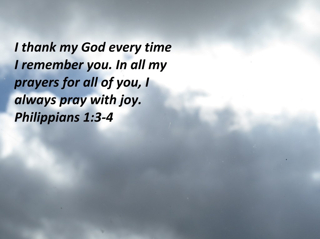 I thank my God every time I remember you. In all my prayers for all of you, I always pray with joy. Philippians 1:3-4
