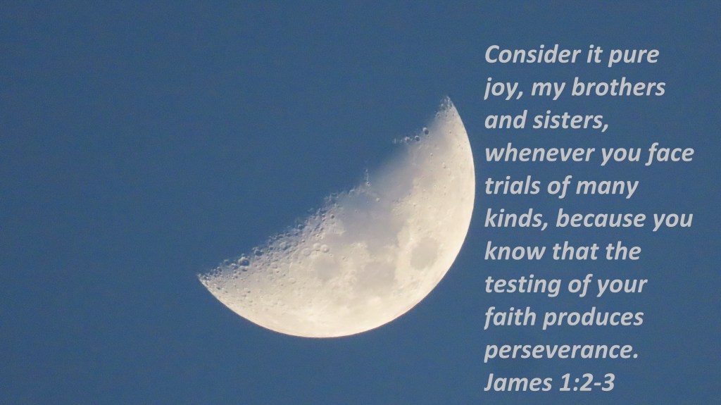 Consider it pure joy, my brothers and sisters, whenever you face trials of many kinds, because you know that the testing of your faith produces perseverance. James 1:2-3