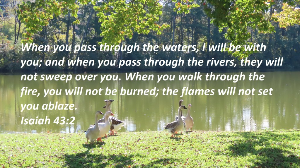 When you pass through the waters, I will be with you; and when you pass through the rivers, they will not sweep over you. When you walk through the fire, you will not be burned; the flames will not set you ablaze. Isaiah 43:2