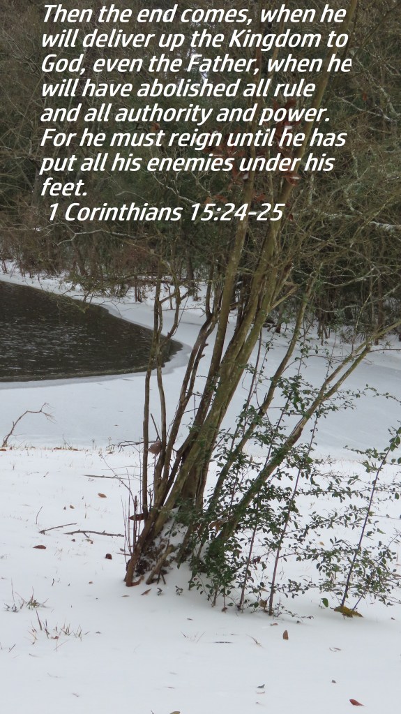 Then the end comes, when he will deliver up the Kingdom to God, even the Father, when he will have abolished all rule and all authority and power. For he must reign until he has put all his enemies under his feet. 1 Corinthians 15:24-25