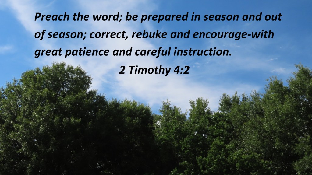 Preach the word; be prepared in season and out of season; correct, rebuke and encourage-with great patience and careful instruction. 2 Timothy 4:2