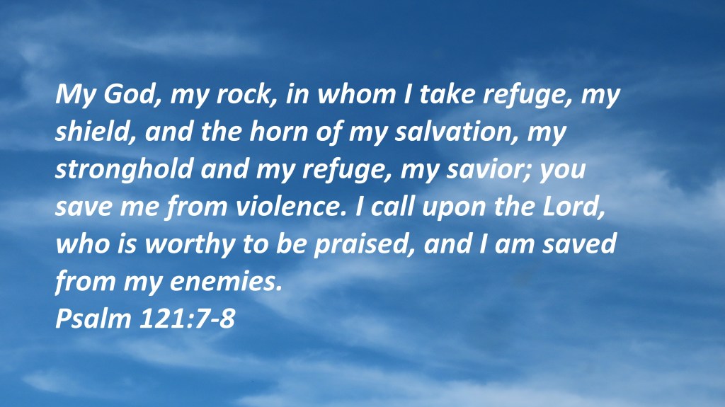 My God, my rock, in whom I take refuge, my shield, and the horn of my salvation, my stronghold and my refuge, my savior; you save me from violence. I call upon the Lord, who is worthy to be praised, and I am saved from my enemies. Psalm 121:7-8