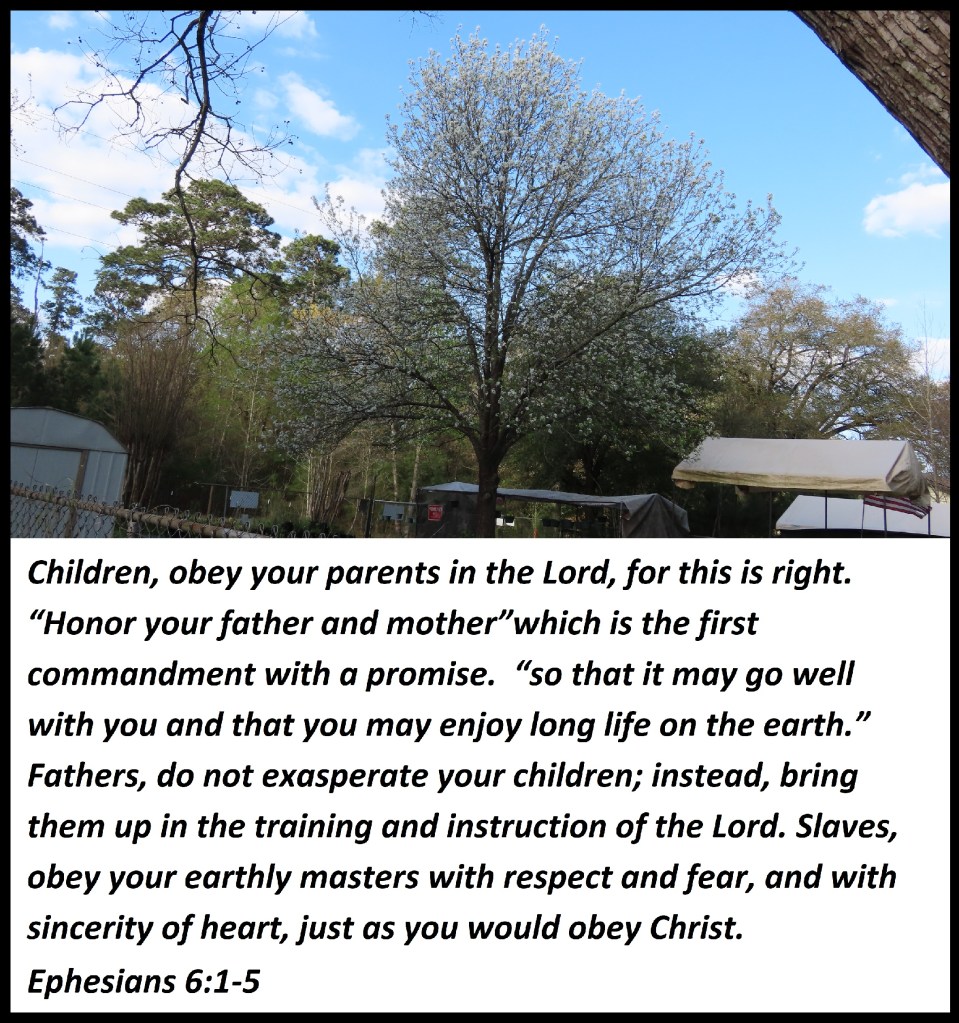 Children, obey your parents in the Lord, for this is right. “Honor your father and mother “which is the first commandment with a promise. “So that it may go well with you and that you may enjoy long life on the earth.” Fathers do not exasperate your children; instead, bring them up in the training and instruction of the Lord. Slaves, obey your earthly masters with respect and fear, and with sincerity of heart, just as you would obey Christ.