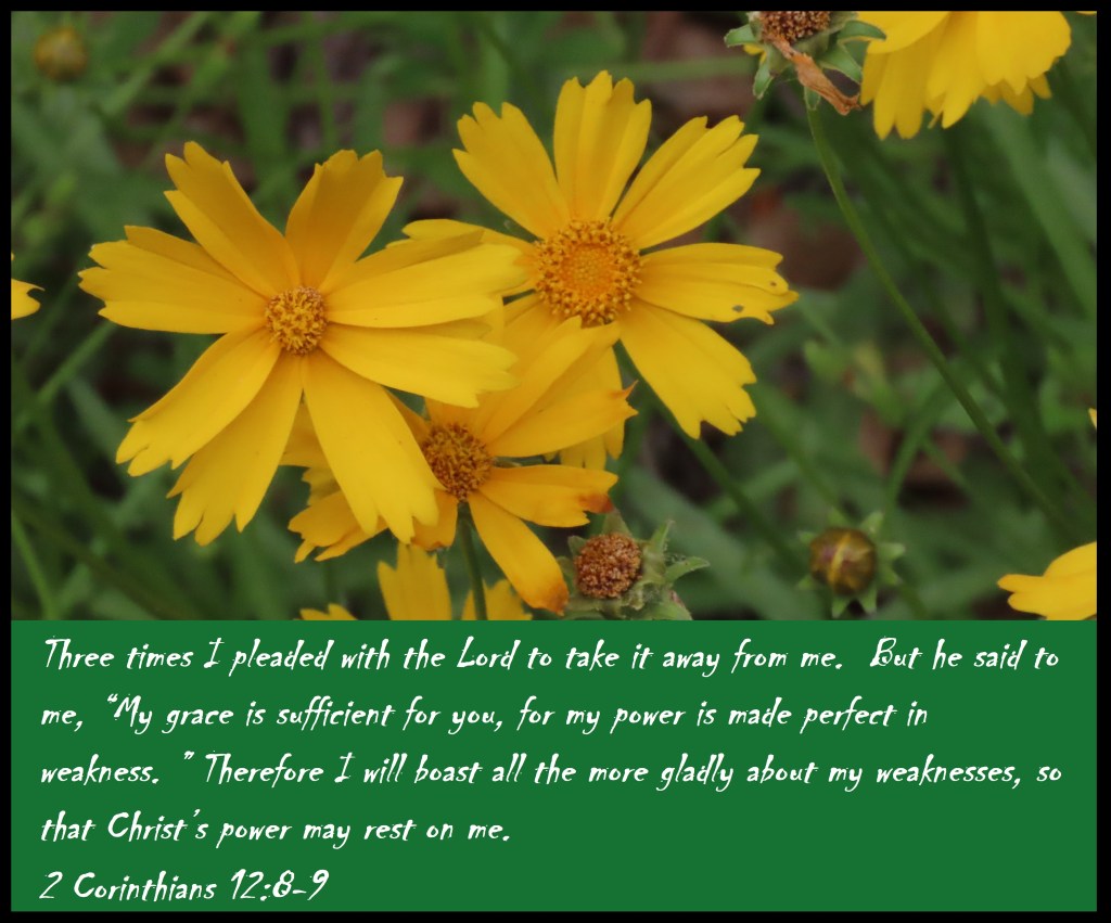 Three times I pleaded with the Lord to take it away from me. But he said to me, “My grace is sufficient for you, for my power is made perfect in weakness.” Therefore, I will boast all the more gladly about my weaknesses, so that Christ’s power may rest on me.