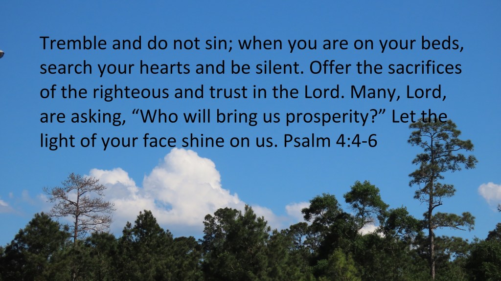 Tremble and do not sin; when you are on your beds, search your hearts and be silent. Offer the sacrifices of the righteous and trust in the Lord. Many, Lord, are asking, “Who will bring us prosperity?” Let the light of your face shine on us. Psalm 4:4-6