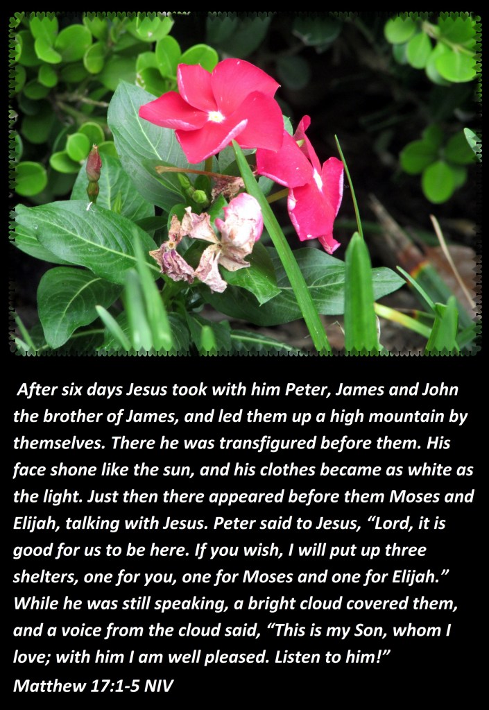After six days Jesus took with him Peter, James and John the brother of James, and led them up a high mountain by themselves. There he was transfigured before them. His face shone like the sun, and his clothes became as white as the light. Just then there appeared before them Moses and Elijah, talking with Jesus. Peter said to Jesus, “Lord, it is good for us to be here. If you wish, I will put up three shelters, one for you, one for Moses and one for Elijah.” While he was still speaking, a bright cloud covered them, and a voice from the cloud said, “This is my Son, whom I love; with him I am well pleased. Listen to him!”