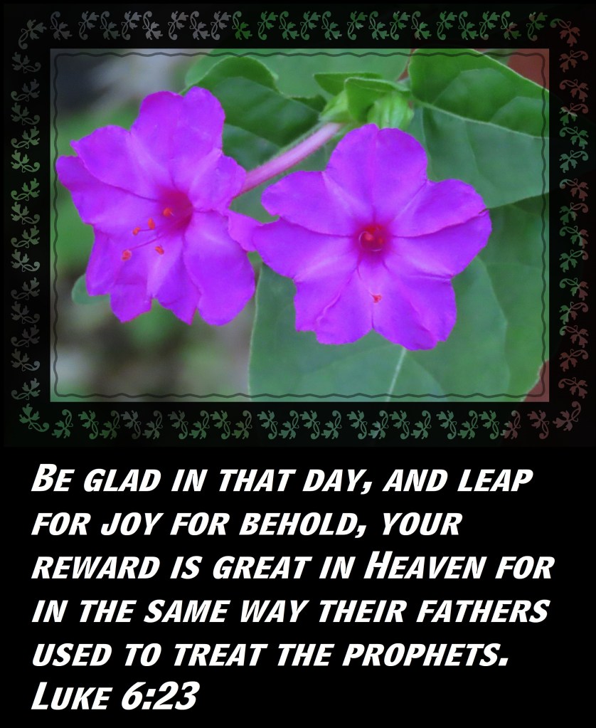 Be glad in that day, and leap for joy for behold, your reward is great in Heaven for in the same way their fathers used to treat the prophets.