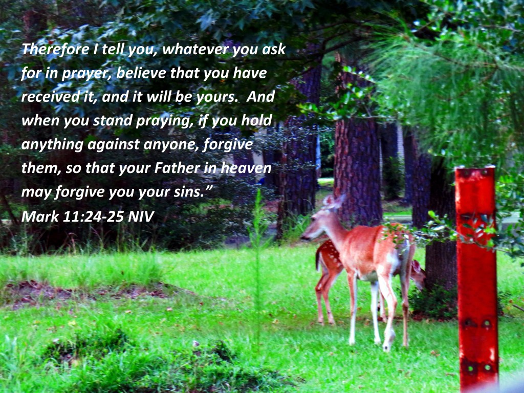 Therefore I tell you, whatever you ask for in prayer, believe that you have received it, and it will be yours. And when you stand praying, if you hold anything against anyone, forgive them, so that your Father in heaven may forgive you your sins.”