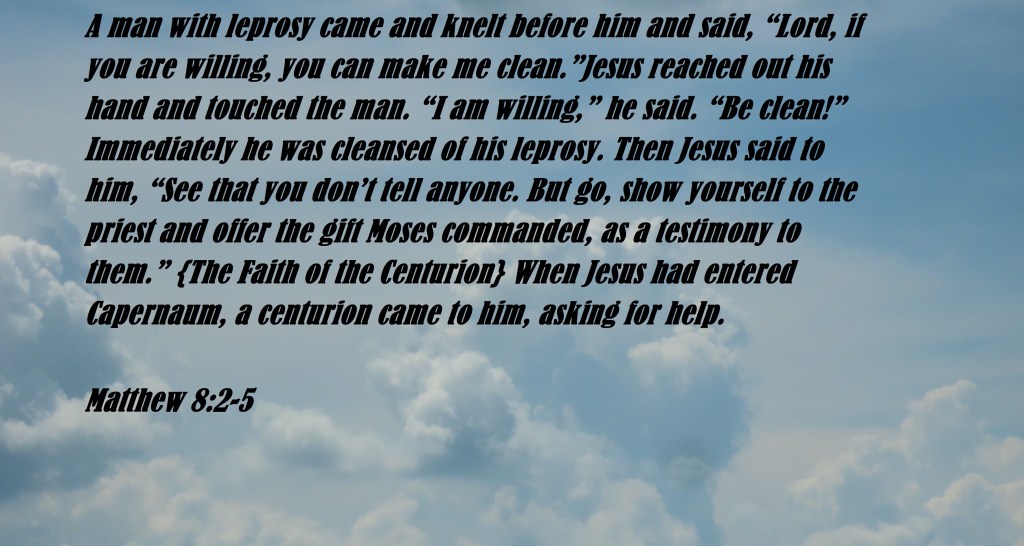 A man with leprosy came and knelt before him and said, “Lord, if you are willing, you can make me clean.” Jesus reached out his hand and touched the man. “I am willing,” he said. “Be clean!” Immediately he was cleansed of his leprosy. Then Jesus said to him, “See that you don’t tell anyone. But go, show yourself to the priest and offer the gift Moses commanded, as a testimony to them.” {The Faith of the Centurion} When Jesus had entered Capernaum, a centurion came to him, asking for help.