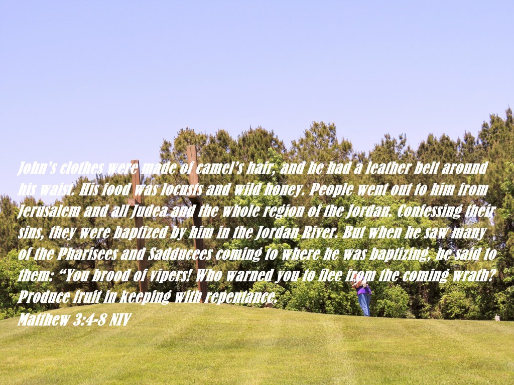 John’s clothes were made of camel’s hair, and he had a leather belt around his waist. His food was locusts and wild honey. People went out to him from Jerusalem and all Judea and the whole region of the Jordan. Confessing their sins, they were baptized by him in the Jordan River. But when he saw many of the Pharisees and Sadducees coming to where he was baptizing, he said to them: “You brood of vipers! Who warned you to flee from the coming wrath? Produce fruit in keeping with repentance.