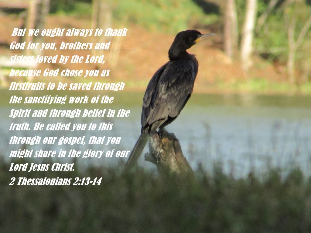 But we ought always to thank God for you, brothers and sisters loved by the Lord, because God chose you as firstfruits to be saved through the sanctifying work of the Spirit and through belief in the truth. He called you to this through our gospel, that you might share in the glory of our Lord Jesus Christ.