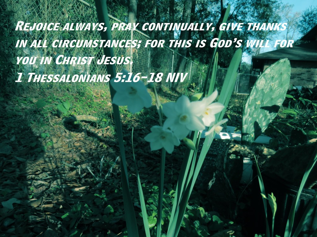 Rejoice always, pray continually, give thanks in all circumstances; for this is God’s will for you in Christ Jesus.
