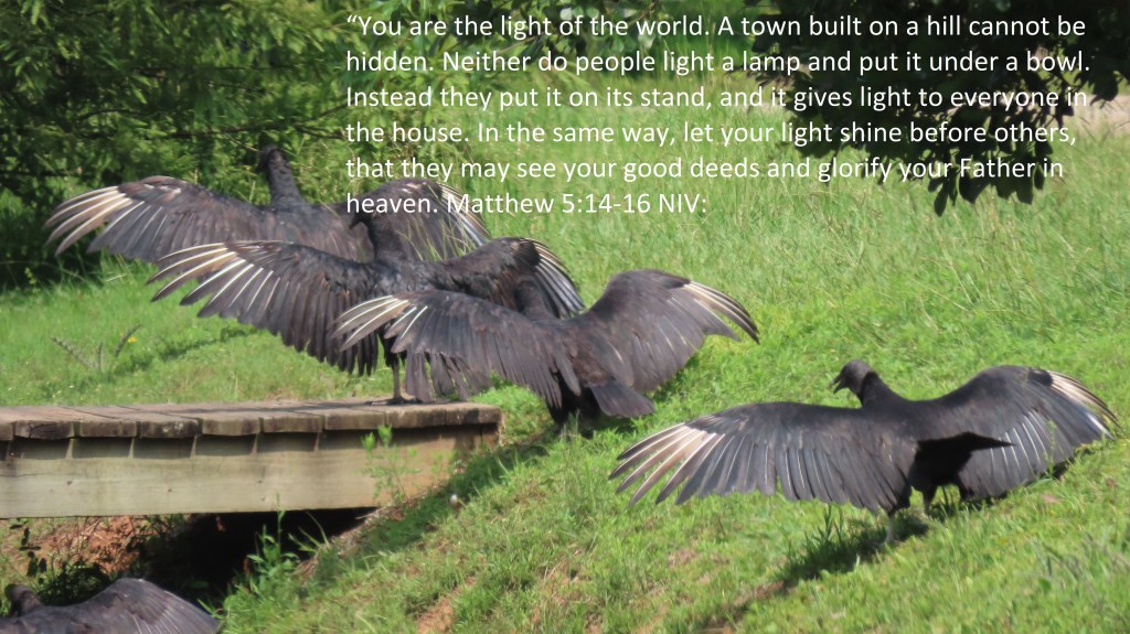 “You are the light of the world. A town built on a hill cannot be hidden. Neither do people light a lamp and put it under a bowl. Instead they put it on its stand, and it gives light to everyone in the house. In the same way, let your light shine before others, that they may see your good deeds and glorify your Father in heaven.