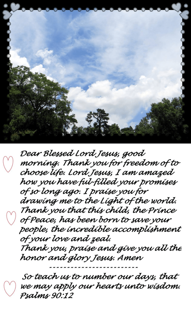 Dear Blessed Lord Jesus, good morning. Thank you for freedom to choose life. Lord Jesus, I am amazed how you have ful-filled your promises of so long ago. I praise you for drawing me to the Light of the world. Thank you that this child, the Prince of Peace, has been born to save your people, the incredible accomplishment of your love and zeal.