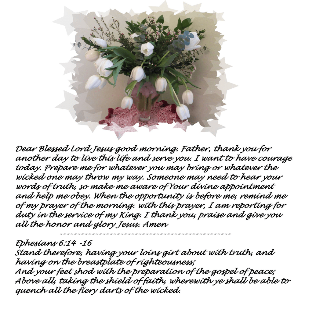 Dear Blessed Lord Jesus good morning. Father, thank You for another day to live this life and serve You. I want to have courage today. Prepare me for whatever You may bring or whatever the wicked one may throw my way. Someone may need to hear Your words of truth, so make me aware of Your divine appointment and help me obey. When the opportunity is before me, remind me of my prayer of the morning. With this prayer, I am reporting for duty in the service of my King. I love You, thank You, praise and give You all the honor and glory Jesus. Amen!