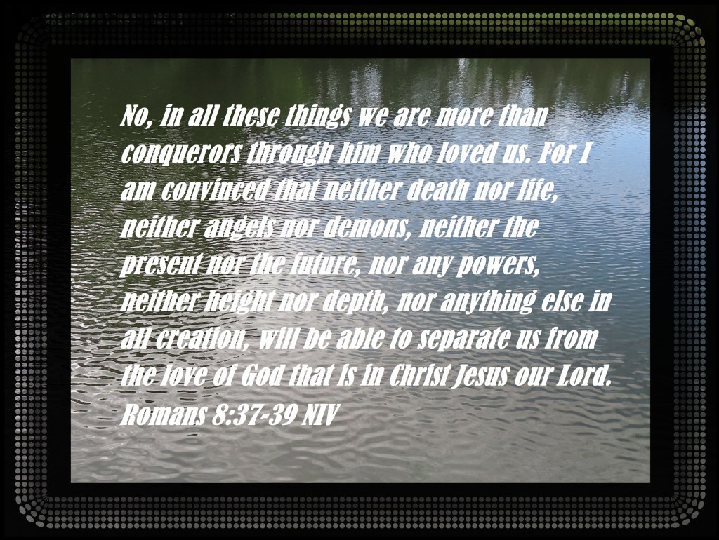No, in all these things we are more than conquerors through him who loved us. For I am convinced that neither death nor life, neither angels nor demons, neither the present nor the future, nor any powers, neither height nor depth, nor anything else in all creation, will be able to separate us from the love of God that is in Christ Jesus our Lord.