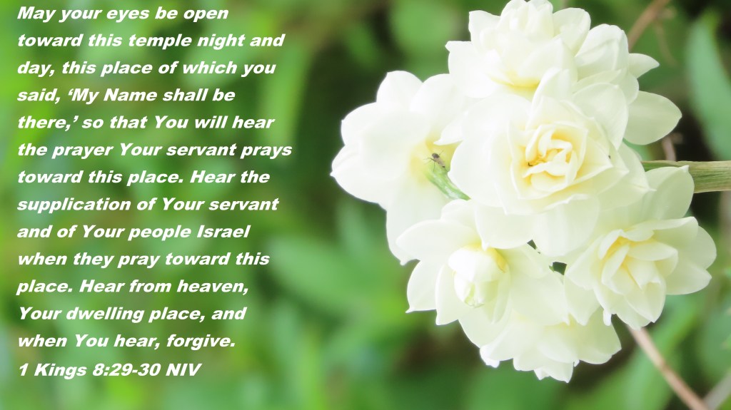 May your eyes be open toward this temple night and day, this place of which you said, ‘My Name shall be there,’ so that You will hear the prayer Your servant prays toward this place. Hear the supplication of Your servant and of Your people Israel when they pray toward this place. Hear from heaven, Your dwelling place, and when You hear, forgive.