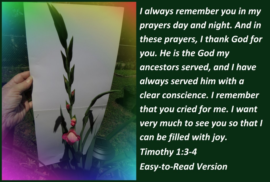 I always remember you in my prayers day and night. And in these prayers, I thank God for you. He is the God my ancestors served, and I have always served him with a clear conscience. I remember that you cried for me. I want very much to see you so that I can be filled with joy. Timothy 1:3-4