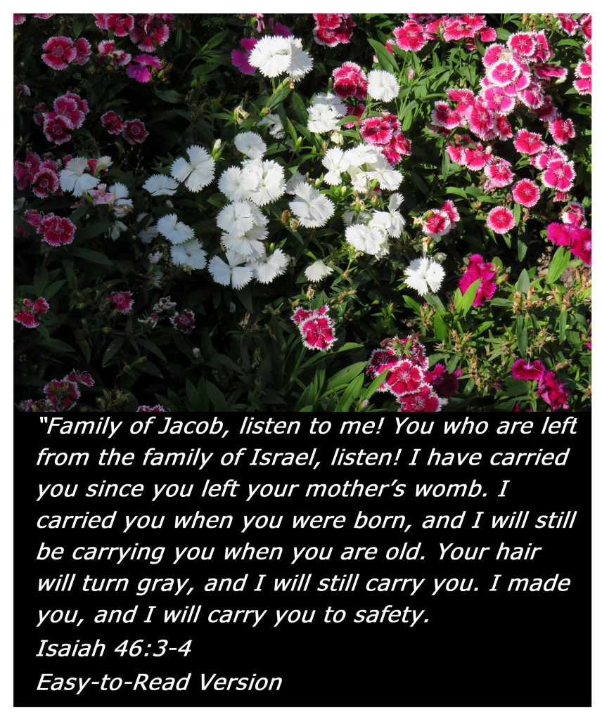 “Family of Jacob, listen to me! You who are left from the family of Israel, listen! I have carried you since you left your mother’s womb. I carried you when you were born, and I will still be carrying you when you are old. Your hair will turn gray, and I will still carry you. I made you, and I will carry you to safety.