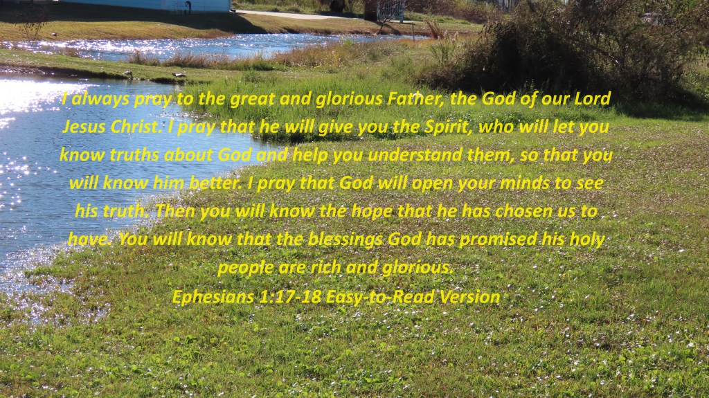I always pray to the great and glorious Father, the God of our Lord Jesus Christ. I pray that he will give you the Spirit, who will let you know truths about God and help you understand them, so that you will know him better. I pray that God will open your minds to see his truth. Then you will know the hope that he has chosen us to have. You will know that the blessings God has promised his holy people are rich and glorious.