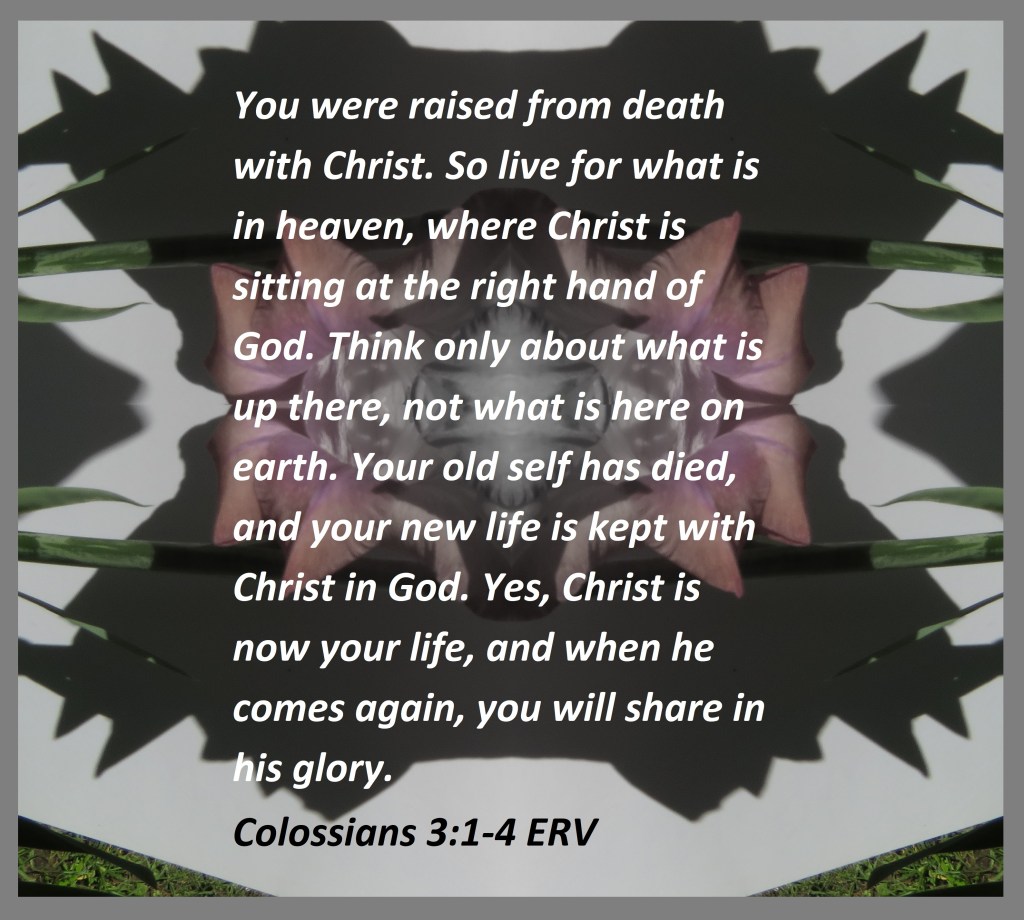 You were raised from death with Christ. So live for what is in heaven, where Christ is sitting at the right hand of God. Think only about what is up there, not what is here on earth. Your old self has died, and your new life is kept with Christ in God. Yes, Christ is now your life, and when he comes again, you will share in his glory.