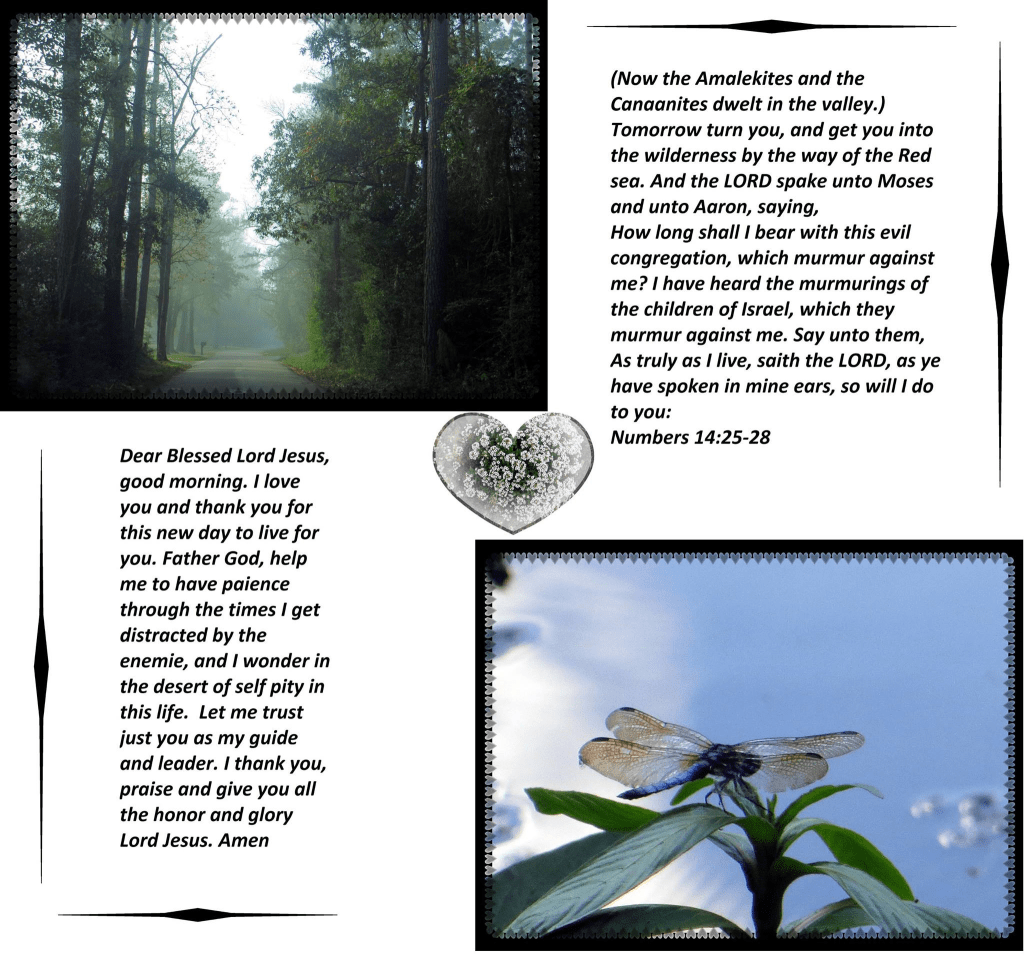 Dear Blessed Lord Jesus, good morning. I love you and thank you for this new day to live for you. Father God, help me to have paience through the times I get distracted by the enemie, and I wonder in the desert of self pity in this life. Let me trust just you as my guide and leader. I thank you, praise and give you all the honor and glory Lord Jesus. Amen.