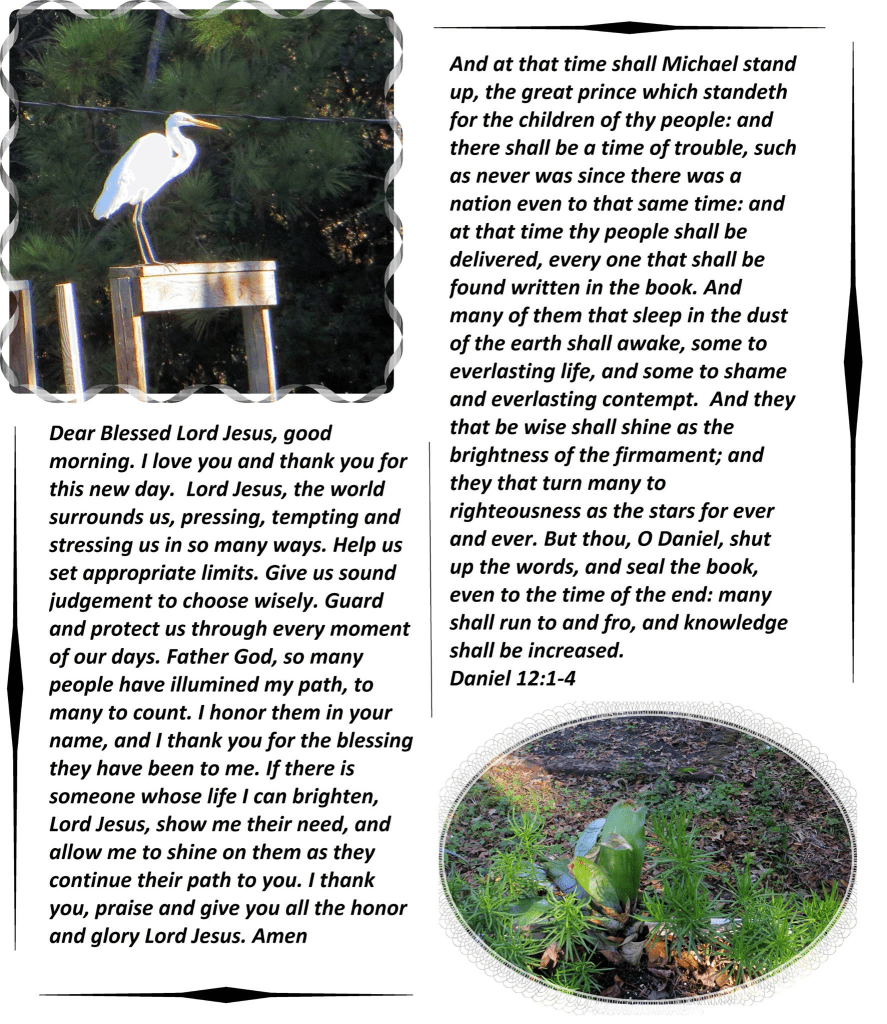 Dear Blessed Lord Jesus, good morning. I love you and thank you for this new day. Lord Jesus, the world surrounds us, pressing, tempting and stressing us in so many ways. Help us set appropriate limits. Give us sound judgement to choose wisely. Guard and protect us through every moment of our days. Father God, so many people have illumined my path, to many to count. I honor them in your name, and I thank you for the blessing they have been to me. If there is someone whose life I can brighten, Lord Jesus, show me their need, and allow me to shine on them as they continue their path to you. I thank you, praise and give you all the honor and glory Lord Jesus. Amen.