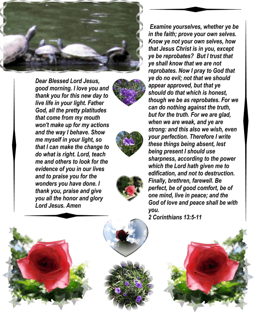 Examine yourselves, whether ye be in the faith; prove your own selves. Know ye not your own selves, how that Jesus Christ is in you, except ye be reprobates? But I trust that ye shall know that we are not reprobates. Now I pray to God that ye do no evil; not that we should appear approved, but that ye should do that which is honest, though we be as reprobates. For we can do nothing against the truth, but for the truth. For we are glad, when we are weak, and ye are strong: and this also we wish, even your perfection. Therefore I write these things being absent, lest being present I should use sharpness, according to the power which the Lord hath given me to edification, and not to destruction. Finally, brethren, farewell. Be perfect, be of good comfort, be of one mind, live in peace; and the God of love and peace shall be with you. 2 Corinthians 13:5-11