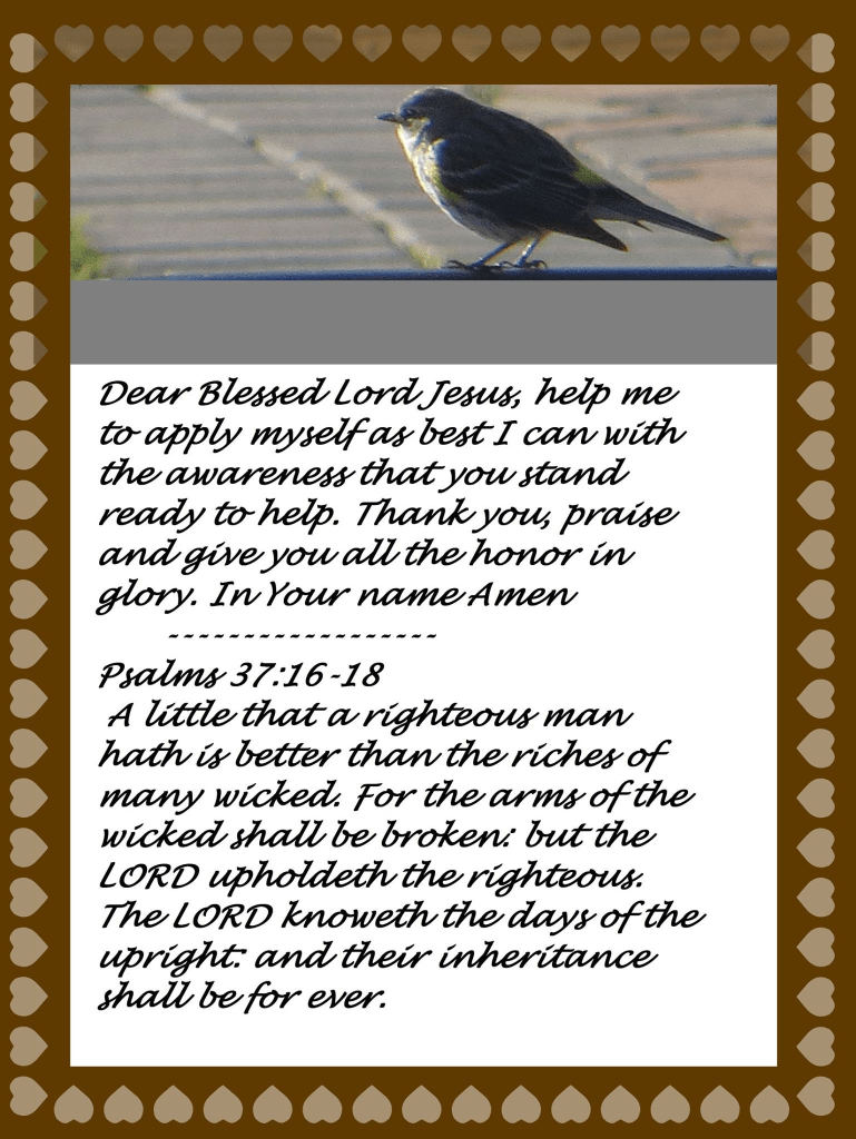 Dear Blessed Lord Jesus, help me to apply myself as best I can with the awareness that you stand ready to help. Thank you, praise and give you all the honor in glory. In Your name Amen.