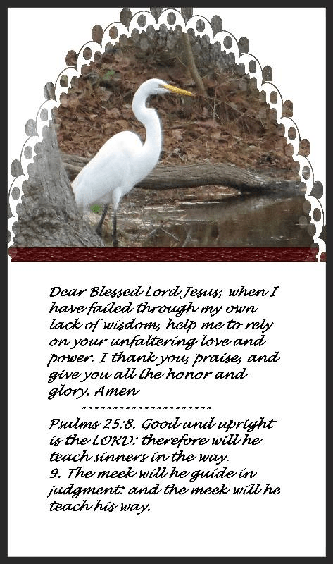 Dear Blessed Lord Jesus, when I have failed through my own lack of wisdom, help me to rely on your unfaltering love and power. I thank you, praise, and give you all the honor and glory. Amen.