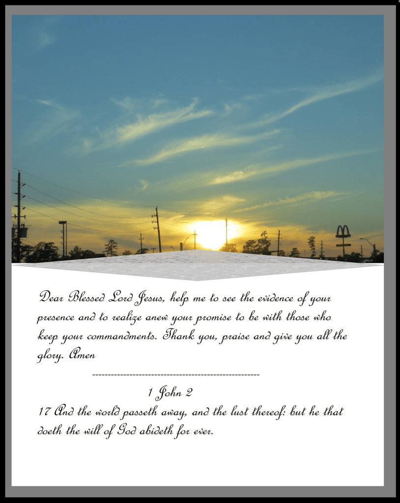 Dear Blessed Lord Jesus, help me to see the evidence of your presence and to realize anew your promise to be with those who keep your commandments. Thank you, praise and give you all the glory. Amen.